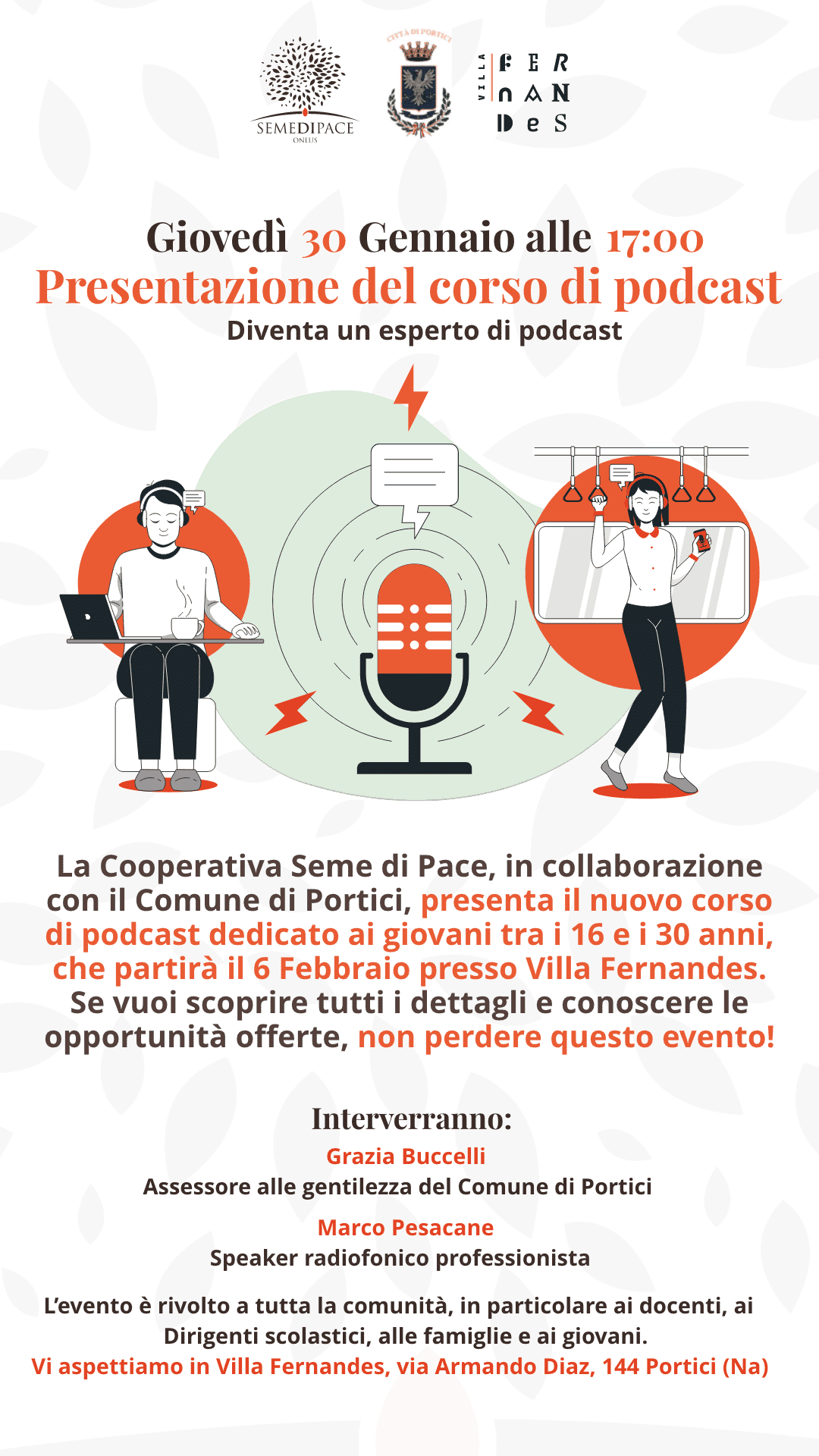 La Cooperativa Seme di Pace, in collaborazione con il Comune di Portici, presenta il nuovo corso di podcast dedicato ai giovani tra i14 ei 30 anni, che partirà il 6 Febbraio presso Villa Fernandes.